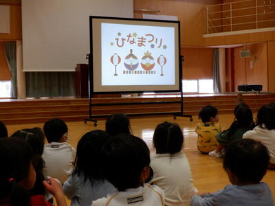 年少児と未満児(あひる組)は、プロジェクター上映で、ひな祭りの由来に親しみました。