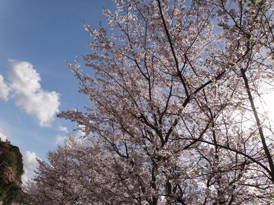園を出て、小学校の近くまで歩いていくと、桜の花が綺麗に咲いていました。