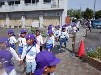 その後は、園庭での横断歩道訓練(年中児)、園周辺の歩行訓練(年長児)を行い、実際に歩いて交通ルールを学んだ子どもたち。日々の登校園、園外保育でも、交通ルールを意識して歩けるようにし、子どもたちの意識を高めていけるといいですね。