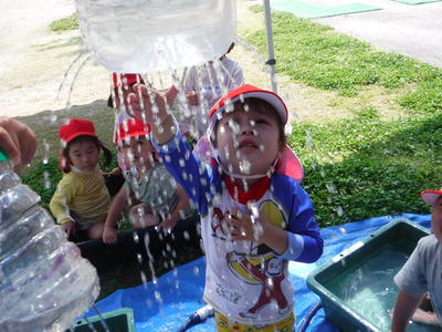 年中さんに泡を分けてもらい、アイスクリームごっこが始まりました。しかし、何度遊んでいても泡が消えていく事件!!年少さんは、泡を増やしたくてつい水を足してしまいます。しかし、水が増えたことで「カルピスできた」と偶然に遊びが変化します。触ってみたり、目で見て感じたりしたことを言葉にしながら、気持ち良さを感じています。