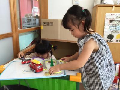 保育室では、塗り絵、ブロック、絵本、ままごと等を先生やお家の人と一緒に楽しみました。