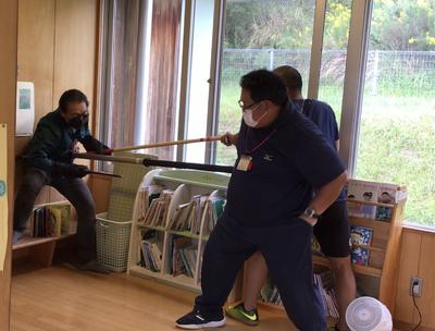 実際に不審者役(森田さん)と先生役、園児役に分かれて行った実技訓練では、刃物を持った不審者に対して『さすまた』(二股に分かれている棒)を使って動きを封じる方法を学びました。