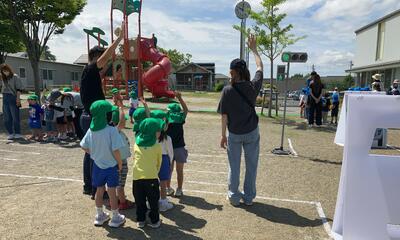 話を聞いた後は年中は園庭に出て模擬信号を使った訓練、年長は実際に園外に出て歩行訓練を行いました。